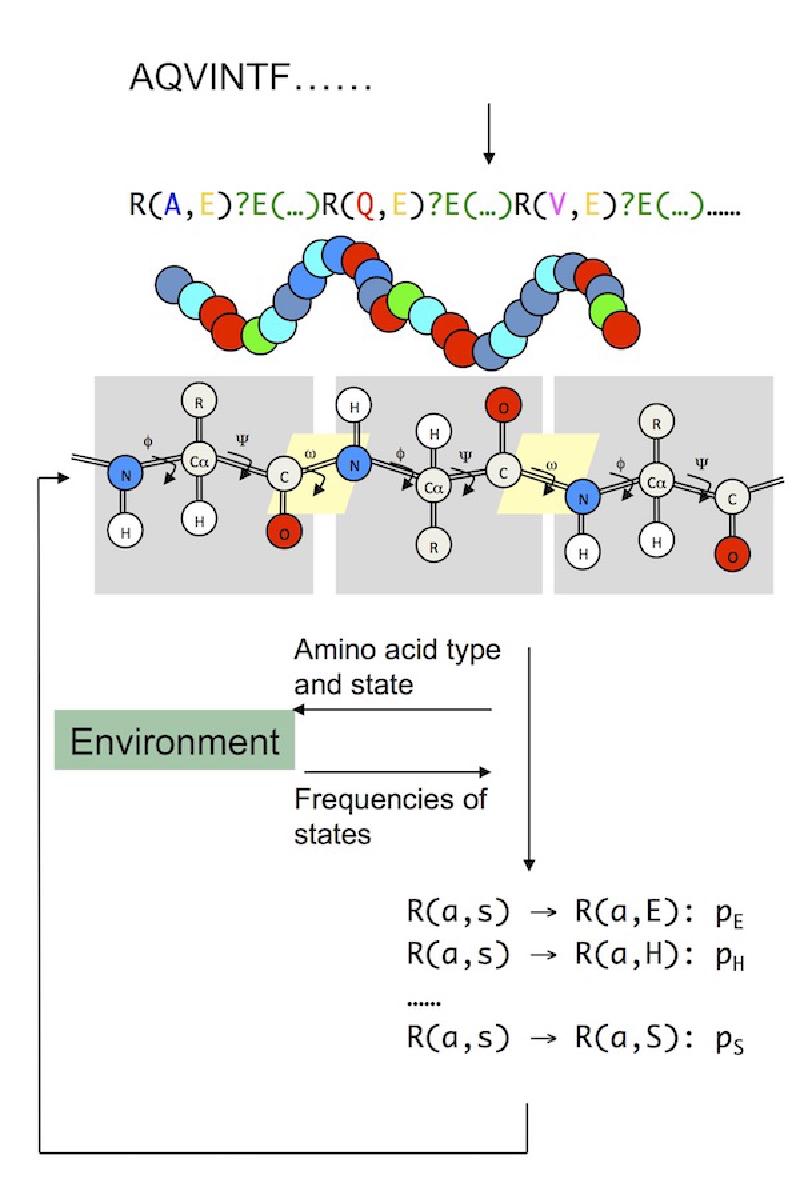 A knowledge-based stochastic model uses parallel rewriting rules that operate on the secondary structure states of residues according to probabilities that are statistically derived from native protein structures. This model leads to the emergence of global conformations with protein-like secondary structure patterns.
